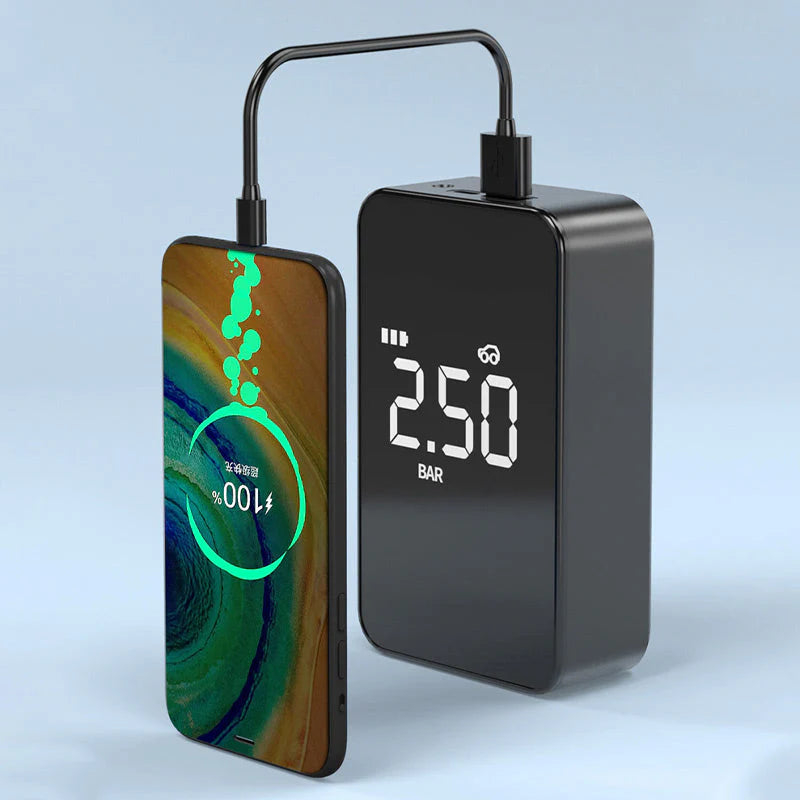 Además de inflar neumáticos, incorpora linterna integrada para uso nocturno y función de power bank para cargar dispositivos en situaciones imprevistas. Una solución práctica para carretera, camping o uso diario.